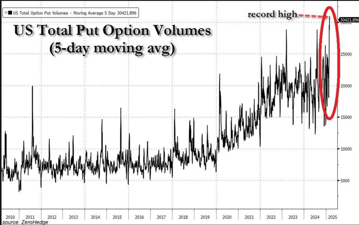 미국의 총 풋옵션 거래량(5일 이동 평균)이 사상 최고치인 30,421.896에 도달했습니다. 이러한 전례 없는 급등은 트레이더와 투자자들 사이에서 우려와 추측을 불러일으키고 있습니다.
