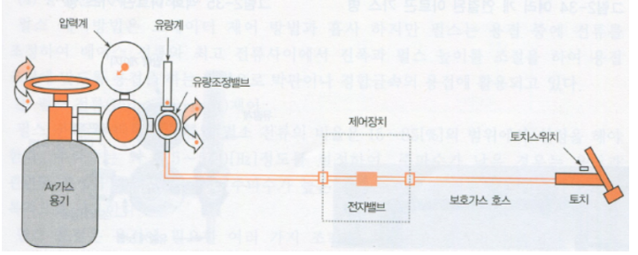 비용극식이나 용극 식 모두 보호가스는 불활성 아르곤(Ar) 가스를 주로 사용한다.