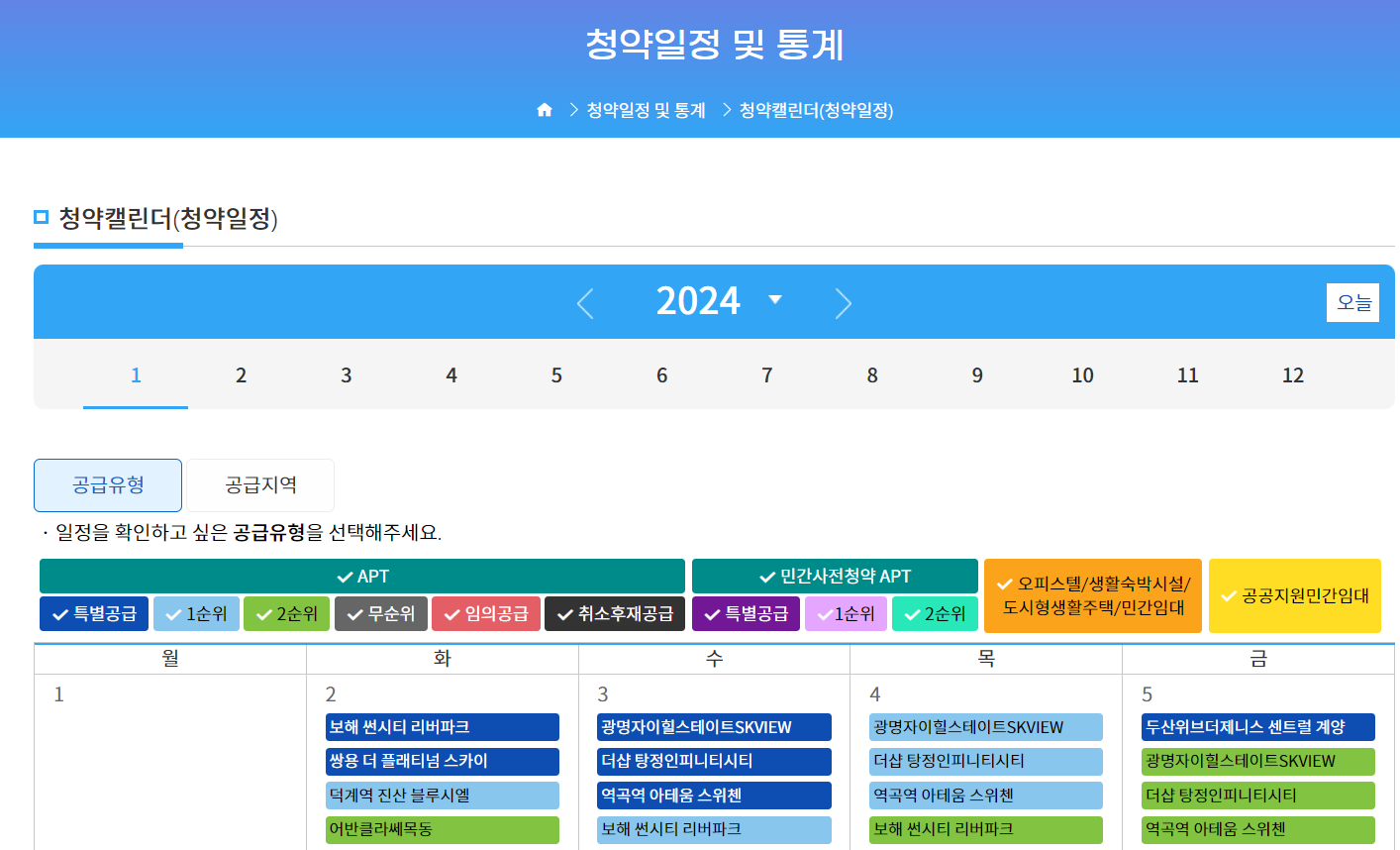 주택청약을 위해서는 청약홈에서 청약캘린더를 통해서 주택청약 정보를 알 수 있습니다.